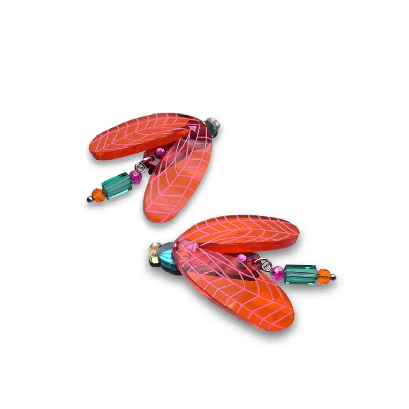 Colores: Cuerpo granate y turquesa, cabeza dorada, alas naranja transparente con suave grabado en rosa, abalorios que cuelgan naranja, turquesa y rosa transparentes, piedras de los ojos iridiscentes.