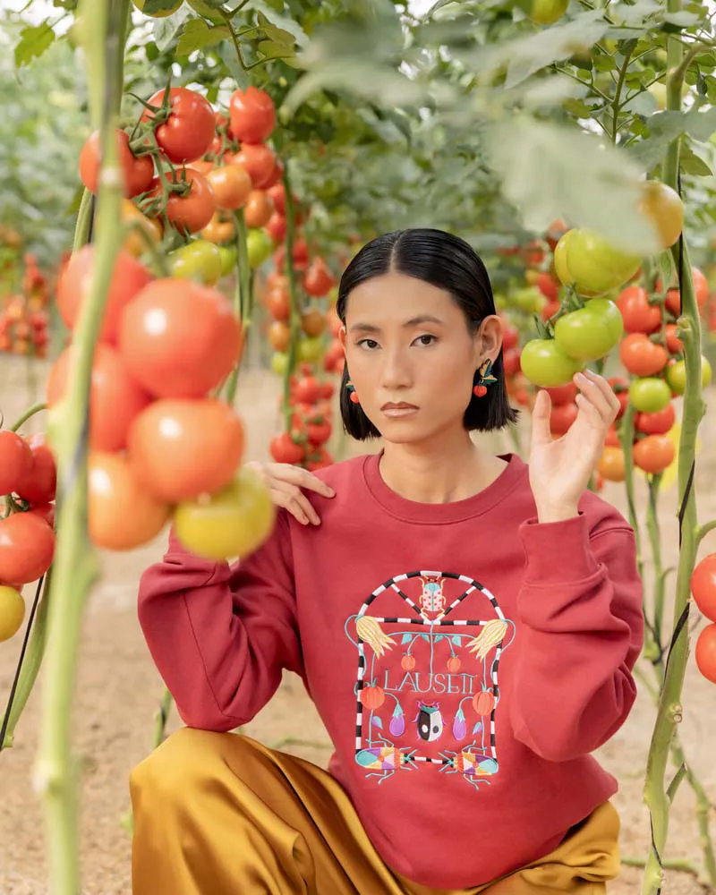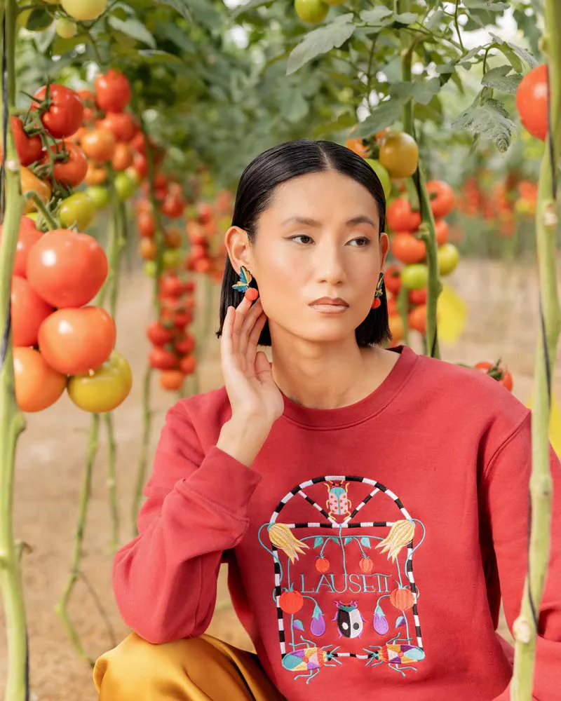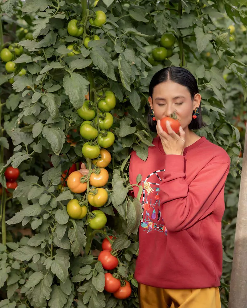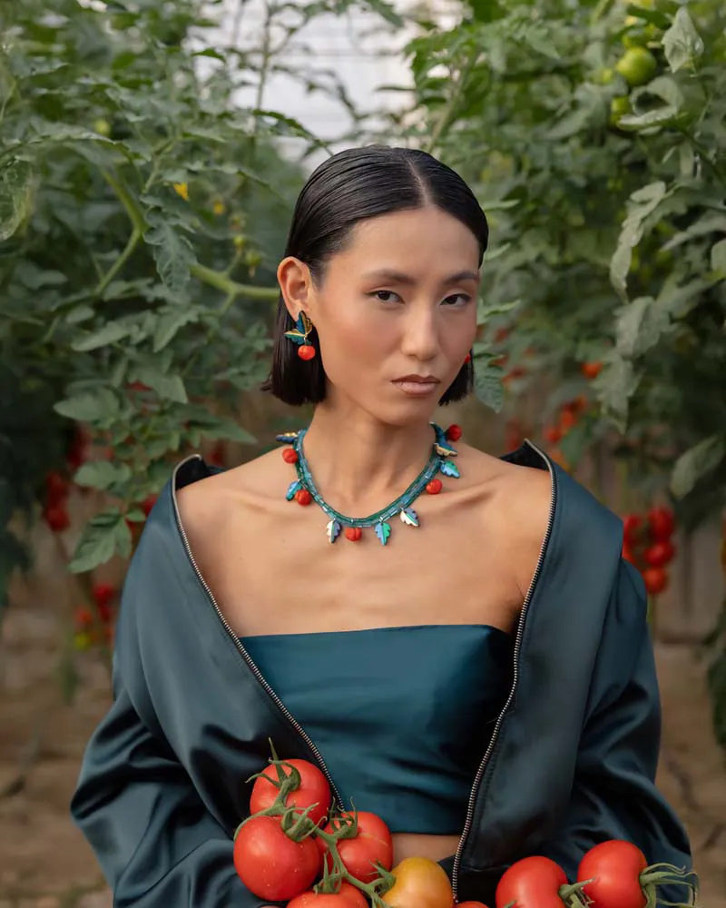 Colores: dorado, verde esmeralda, azul oscuro. Tomate rojo y verde.